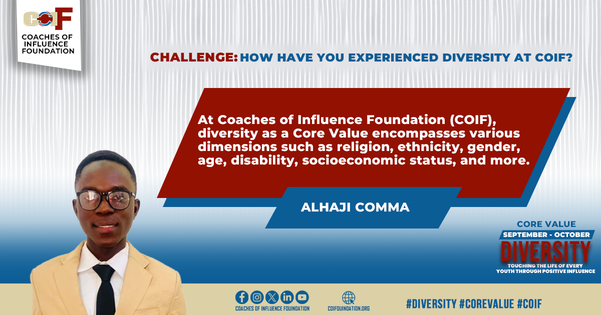 At Coaches of Influence Foundation (COIF), diversity as a Core Value encompasses various dimensions such as religion, ethnicity, gender, age, disability, socioeconomic status, and more.